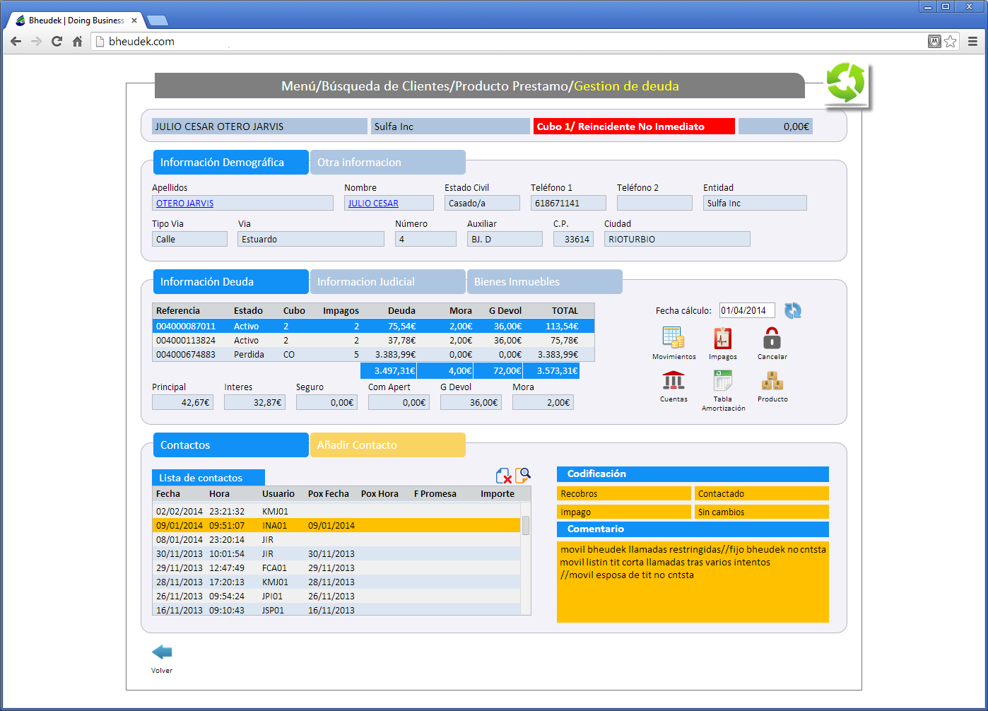 - Ciclo de vida complete del préstamo: remesas, impagos, pagos parciales, recobros, fallido, etc.